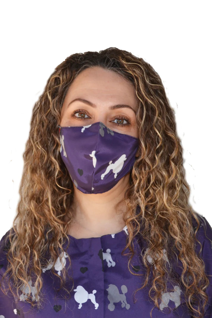 Transform your grooming experience with the Purple Poodle Print Mask, designed to keep you stylish while protecting your face from hair, dust, and debris during work or leisure activities. Imagine confidently grooming dogs without worrying about stray hairs clinging to your skin. This mask features a vibrant purple poodle design that adds a playful touch to your professional attire, effortlessly coordinating with our matching waterproof smock and apron.